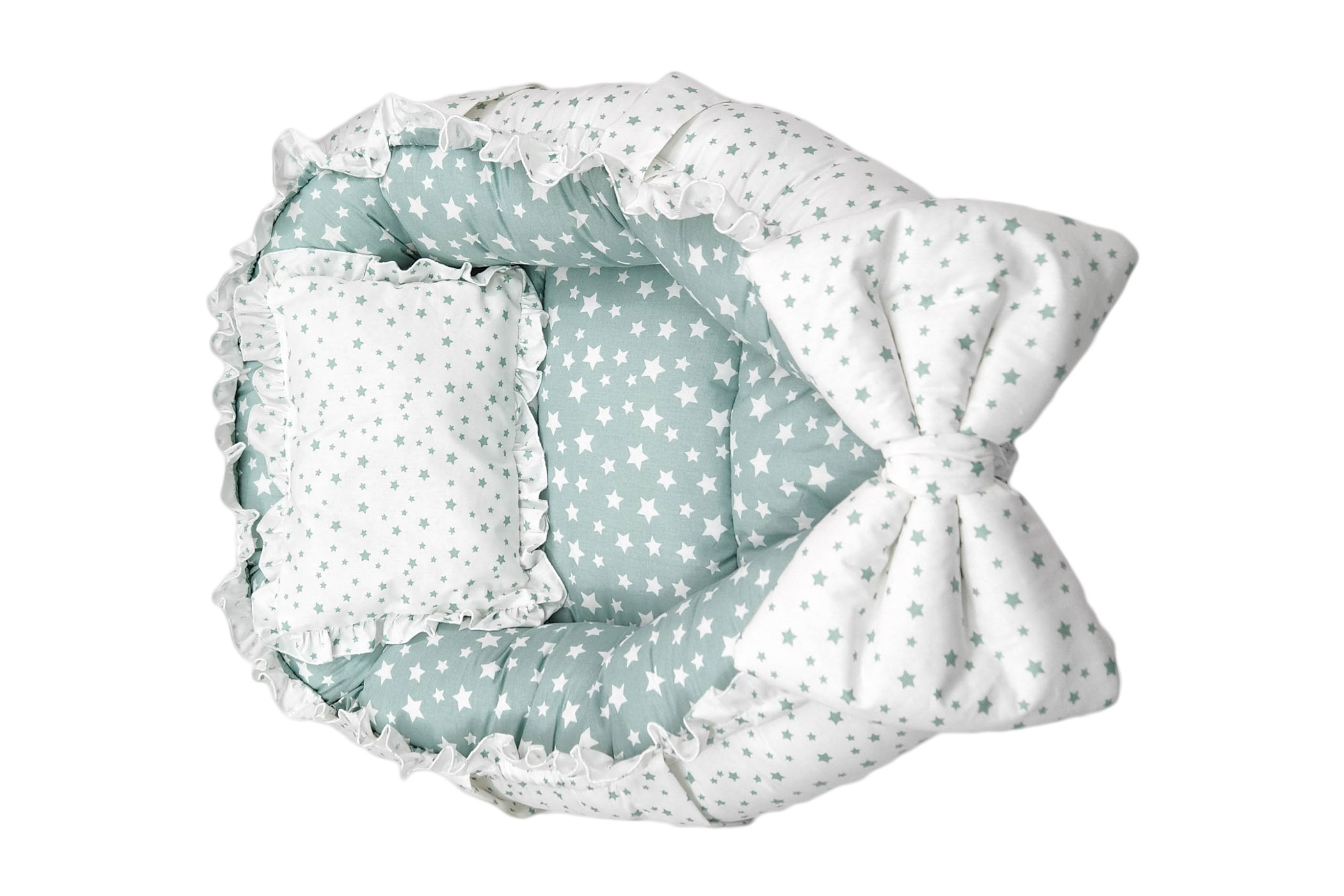Baby Nest 3 piese, culoare turcoaz, din bumbac imprimat. Cosulet bebe necesar pentru un plus de siguranta si confort. Pernuta si paturica asortata.