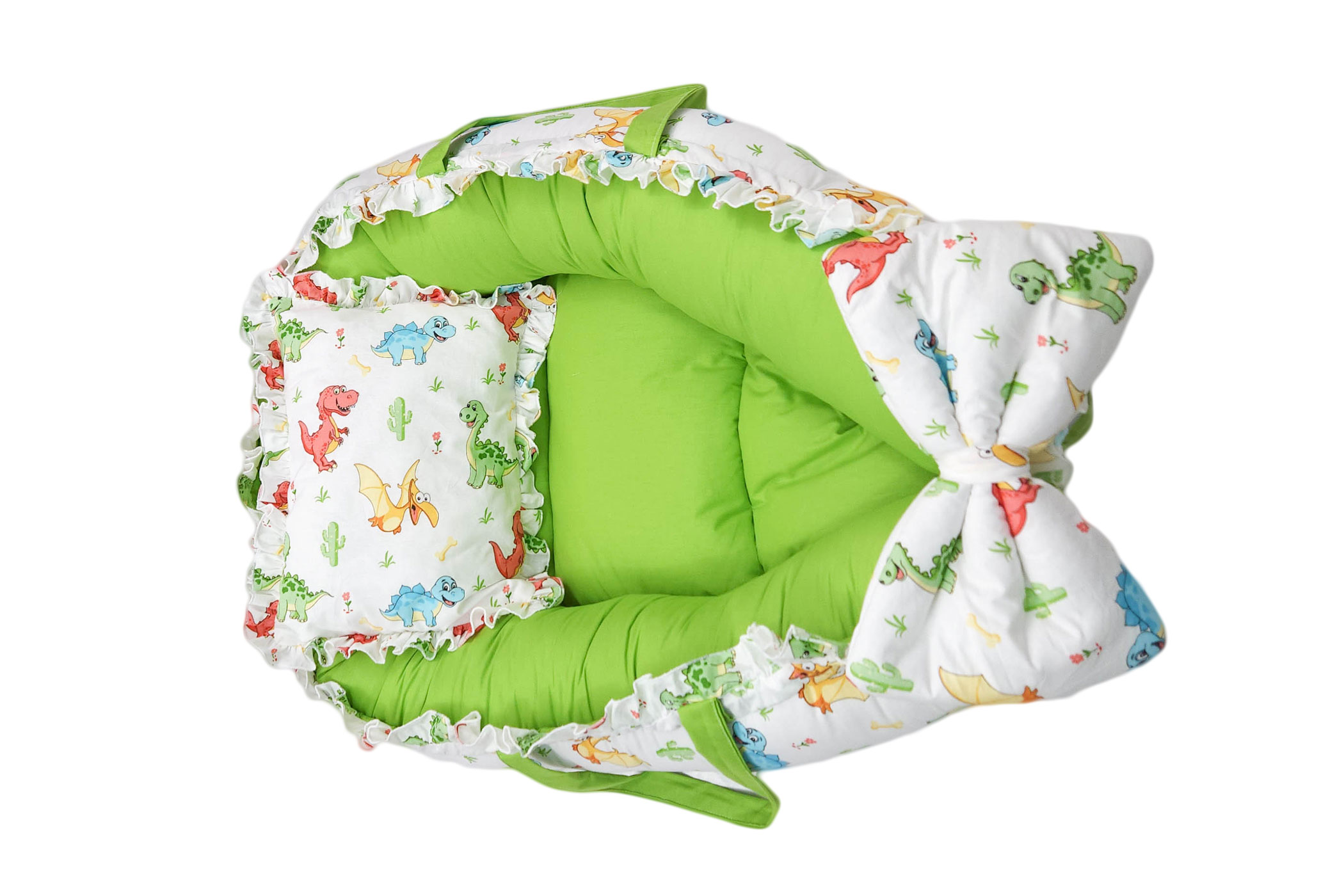 Baby Nest 3 piese, culoare verde, din bumbac imprimat. Cosulet bebe necesar pentru un plus de siguranta si confort. Pernuta si paturica asortata.
