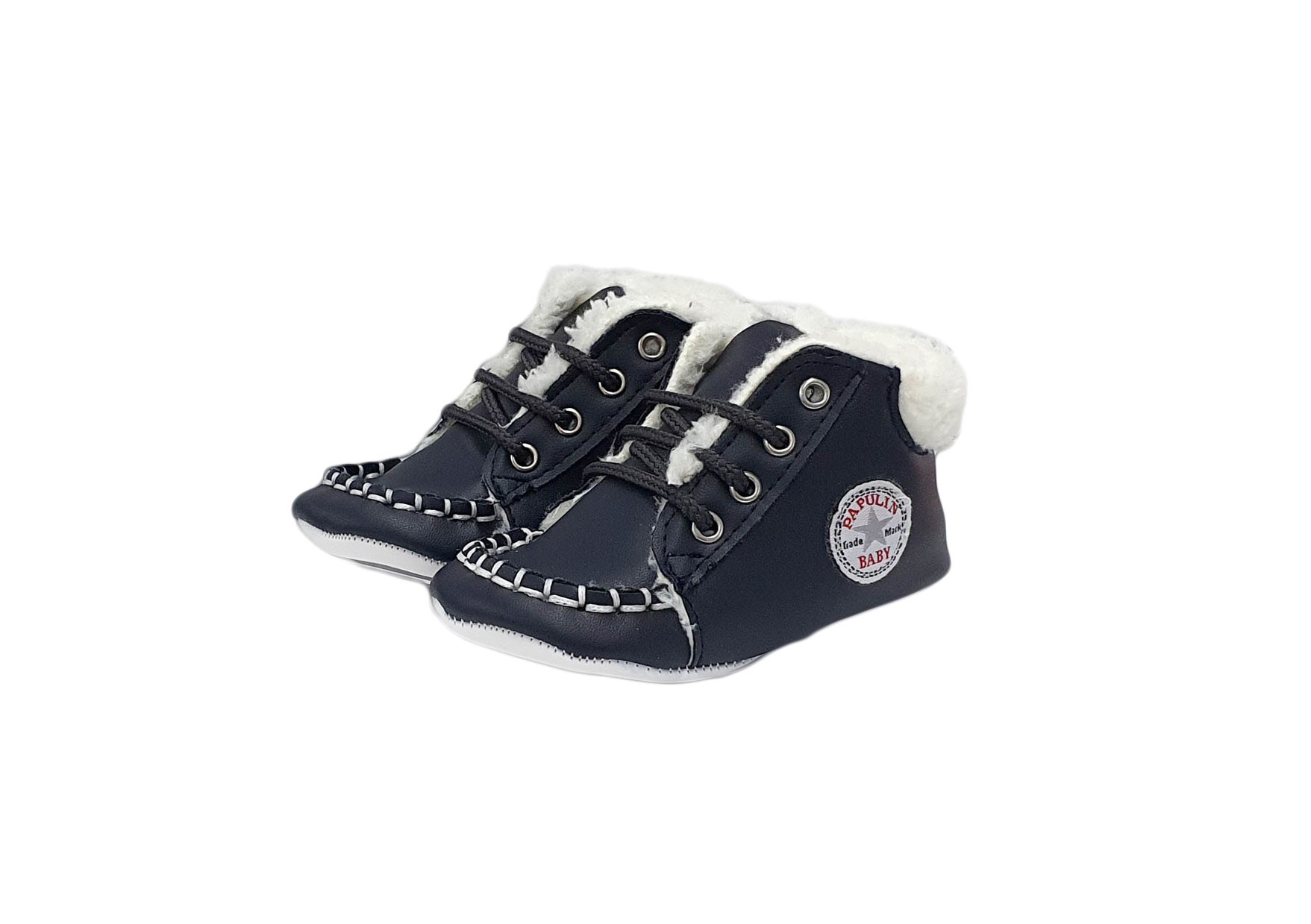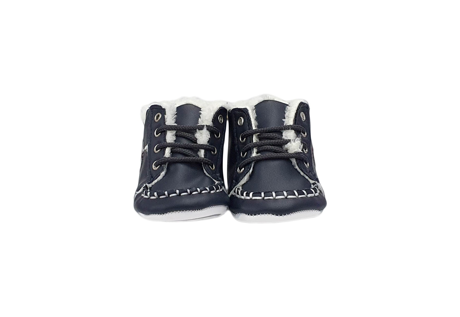 Botosei model mocasin, culoare bleumarin, simpatici si comozi. Botoseii pentru bebe sunt realizati la exterior din piele ecologica si blanita artificiala. La interior sunt cu bumbac moale pentru confortul bebelusului. Sunt potriviti oricarei tinute de botez si nu numai. Un model trendy de botosei ce va pune in evidenta tinuta bebelusului, baietelului.