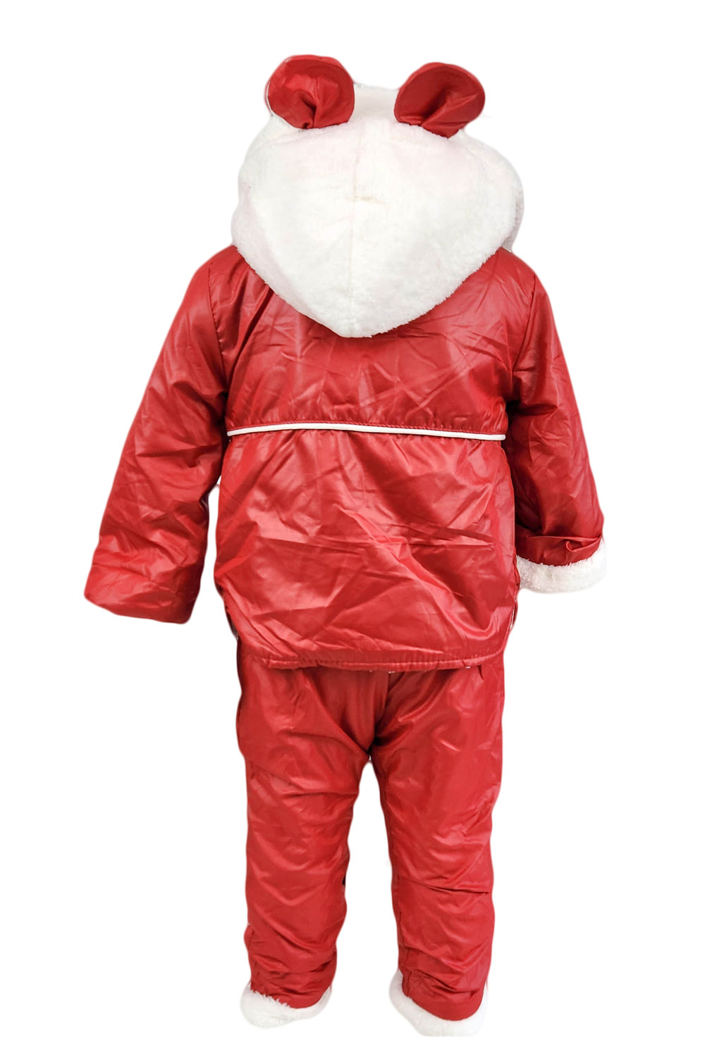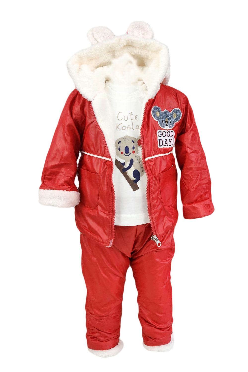 Compleu baieti, Style, trei piese, culoare rosie, din fas cu blanita, elegant-casual. Compleul este alcatuit din trei piese, jacheta, bluza cu maneca lunga si pantaloni. Jacheta este de culoare rosie. Se incheie cu fermoar. Bluza de culoare alba este din bumbac. Are maneca lunga si este cu imprimeu. Pantalonii, sunt din fas si sunt prevazuti cu elastic in talie. Compleul are un aspect deosebit ce te va scoate in evidenta. Compleu baieti, Style, trei piese, culoare rosie, un model trendy potrivit pentru o tinuta lejera.