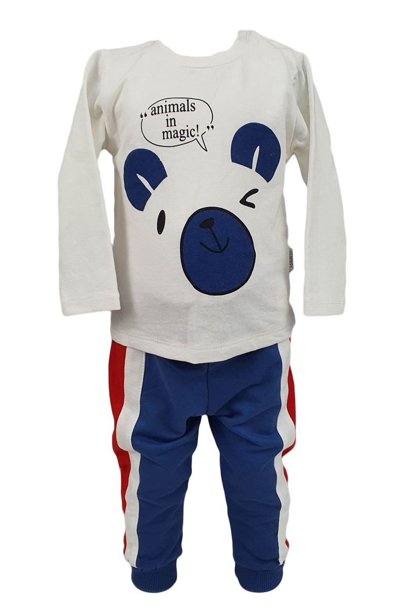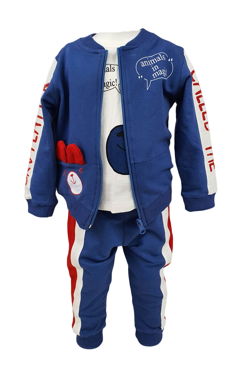 Compleu baieti, trei piese, culoare albastru-bleumarin din bumbac. Compleul este alcatuit din trei piese: jacheta, bluza cu maneca lunga si pantaloni. Bluza este din bumbac si are culoare albastra. Are imprimeu. Bluza de culoare alba este din bumbac. Are maneca lunga. Pantalonii sunt din bumbac. Sunt prevazuti cu elastic in talie. Compleu baieti, trei piese, culoare albastru-bleumarin din bumbac, un model trendy potrivit pentru o tinuta lejera. Compleul este perfect asortat.