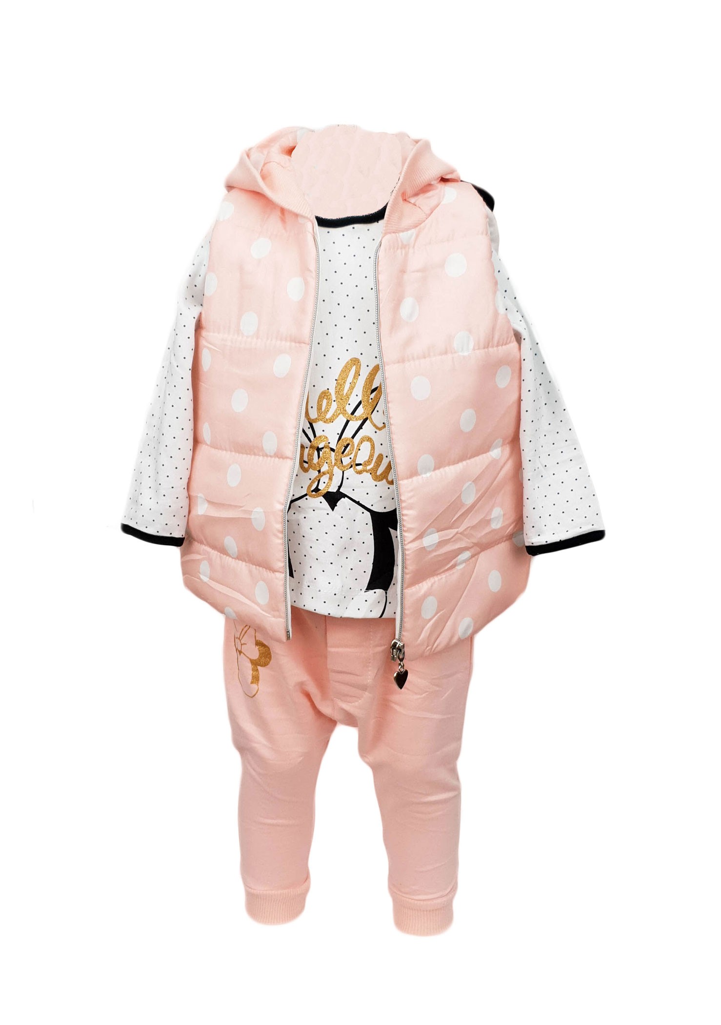 Compleu trei piese: vesta, bluza cu maneca lunga si pantaloni cu turul lasat. Vesta de culoare roz cu buline se incheie cu fermoar. Este prevazuta cu gluga. Bluza de culoare alba cu buline este din bumbac, are maneca lunga si este imprimata. Pantalonii cu turul lasat, sunt din bumbac si sunt prevazuti cu elastic in talie. Un model trendy potrivit pentru o tinuta lejera.