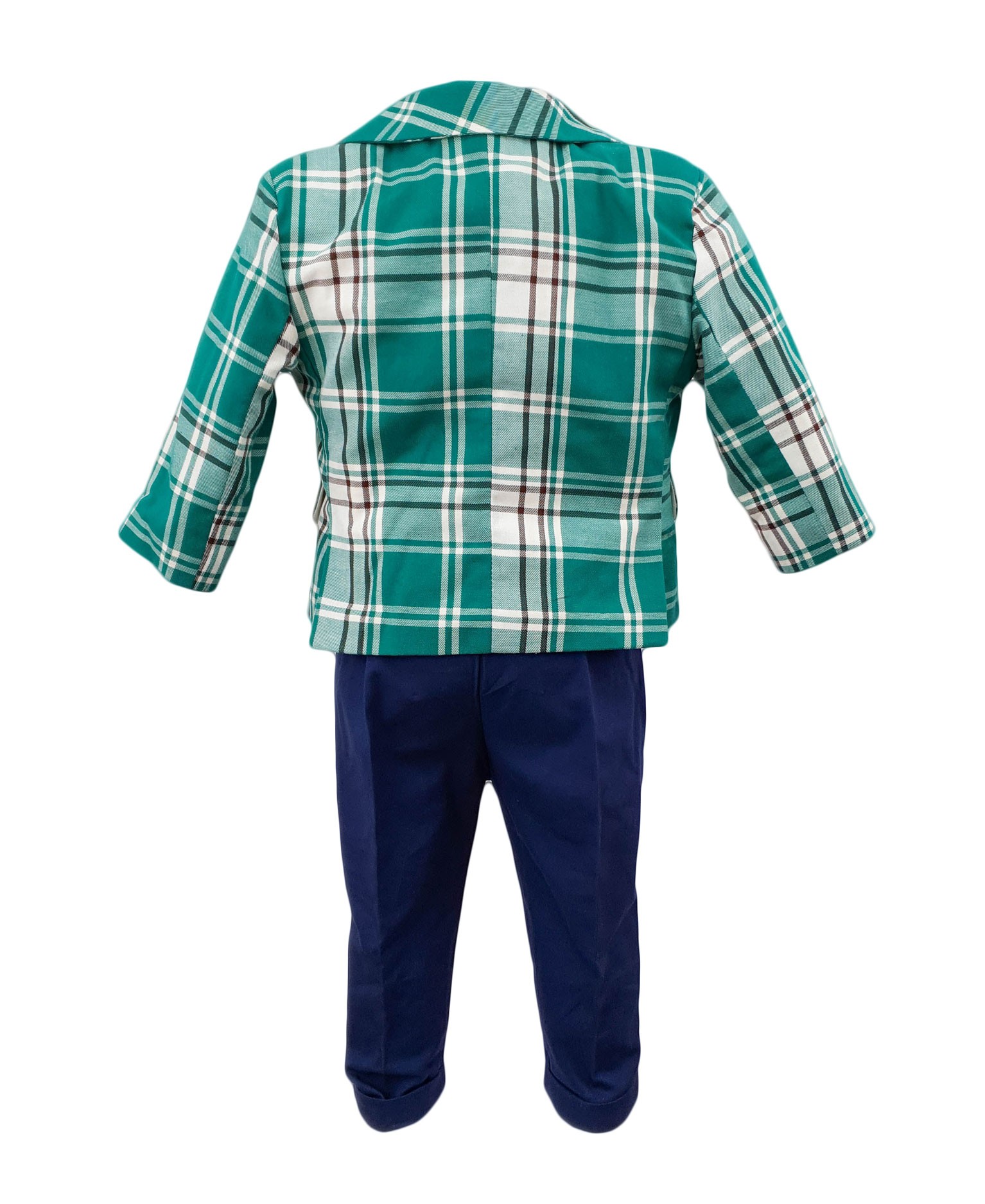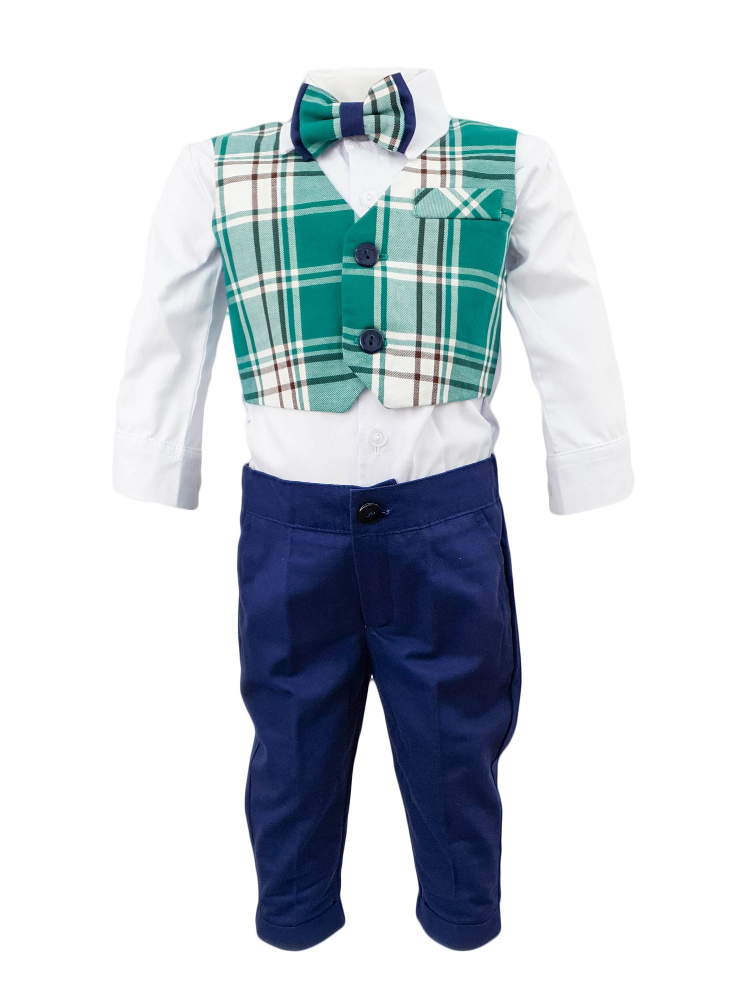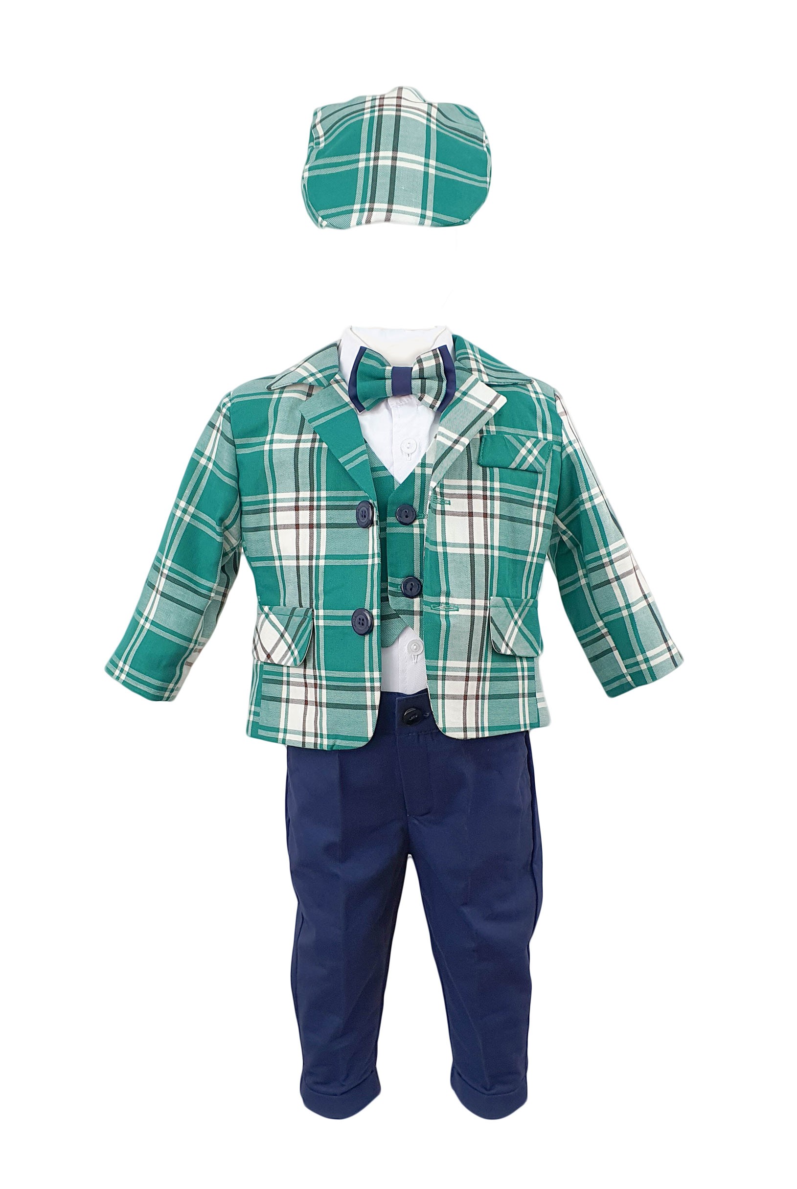 Costum botez Baby Boss, carouri verzi-albe confectionat din bumbac. Este compus din cinci piese ce confera o tinuta elganta sau casual. Sacou, pantaloni, camasa cu maneca lunga cu vesta atasata, papion si bascuta, toate perfect asortate. Sacoul, vestuta si basca sunt in carouri verzi-albe, camasa cu maneca lunga este de culoare alba, pantalonii bleumarin iar papionul asortat. Imbinarea culorilor este perfecta. Este costumul perfect pentru o tinuta eleganta sau casual acolo unde tinuta o cere. Pentru o imbracare facila pantalonii sunt prevazuti cu elastic in talie. Camasa se incheie cu nasturi. Costumul Baby Boss este cu un model versatil, elegant sau casual, ce-l face potrivit in orice situatie. Costumul este o replica fideala a costumelor elegante-casual ale adultilor, are buzunare aplicate pe sacou si buzunare la pantaloni. Costumul este confectionat din materiale de calitate pentru confortul bebelusului. Costum botez Baby Boss, carouri verzi-albe, un model trendy ce va face remarcat bebelusul la prima sa petrecere, la botez. Produs fabricat in Romania.