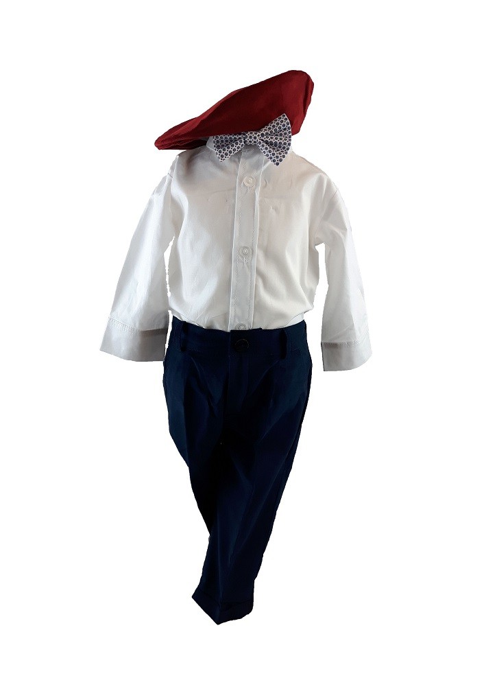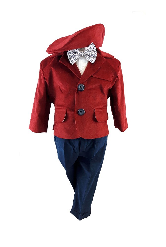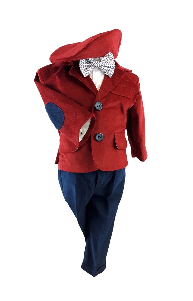 Costum botez Baby Boss raiat bordeaux. Este confectionat din bumbac si raiat. Costumul este compus din cinci piese ce confera o tinuta eleganta sau casual. Sacou, pantaloni, camasa cu maneca lunga, papion si bascuta, toate perfect asortate. Sacoul si basca sunt din raiat de culoare bordeaux. Camasa din bumbac cu maneca lunga, este alba. Pantalonii bleumarin iar papionul multicolor. Imbinarea culorilor este perfecta. Este costumul perfect pentru o tinuta eleganta sau casual acolo unde tinuta o cere. Pentru o imbracare facila pantalonii sunt prevazuti cu elastic in talie, iar camasa se incheie cu nasturi. Costumul este confectionat din bumbac si raiat. Costum botez Baby Boss raiat bordeaux, un model versatil, elegant sau casual, ce-l face potrivit in orice situatie. Costum botez Baby Boss raiat bordeaux, o replica fideala a costumelor elegante-casual ale adultilor, are buzunare aplicate pe sacou, buzunare la pantaloni si cotiere aplicate. Costumul este confectionat doar din materiale de calitate pentru confortul bebelusului. Costumul Baby Boss este un model trendy ce va face remarcat bebelusul la botez. Produs fabricat in Romania.