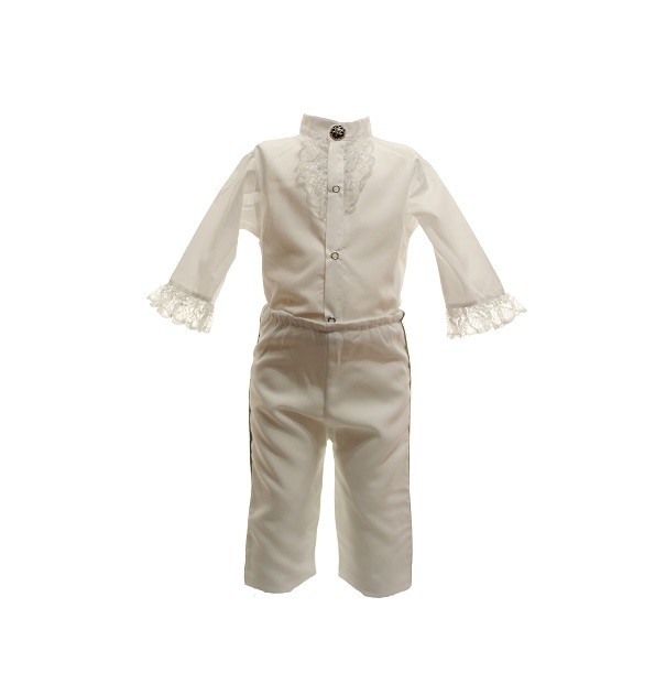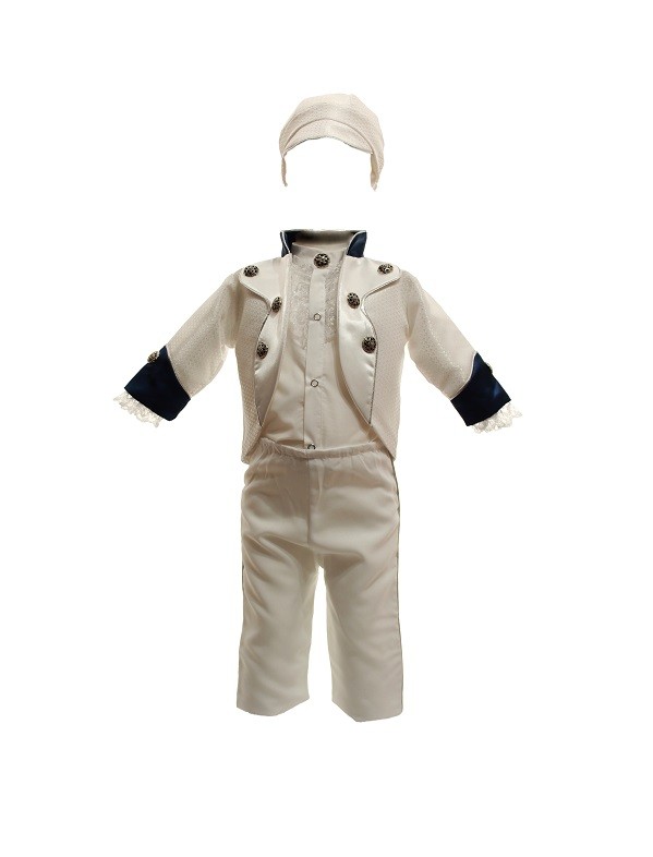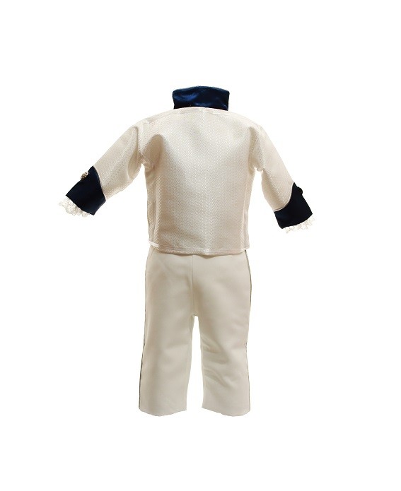Costum Botez Model Micul Imparat Alb-Bleumarin. Este confectionat din bumbac alb-bleumarin si este compus din patru piese ce confera o tinuta aristocrata: redingota, pantaloni, camasa si bascuta, toate perfect asortate. Redingota este alba cu maneci si guler bleumarin, camasa alba cu maneca lunga din bumbac este inobilata cu dantela, pantalonii si bascuta de culoare alba sunt perfect asortate la tinuta. Are un aspect deosebit ce te intoarce cu gandul in perioada balurilor grandioase. Pentru o imbracare facila pantalonii sunt prevazuti cu elastic in talie iar camasa se incheie cu capse. Costumul este confectionat din bumbac. Costum Botez Model Micul Imparat Alb-Bleumarin, un model deosebit pentru un botez de poveste.