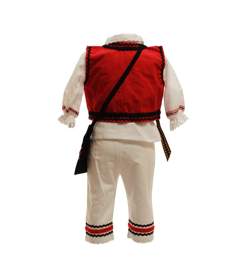 Costum botez traditional, model Ion, confectionat din bumbac. Compus din sapte piese ce confera o tinuta traditionala: ie cu maneca lunga, brau, pantaloni sau itari, vesta, fes, traista si opinci toate perfect asortate. Vesta este de culoare rosie. Braul este cu motive traditionale multicolore. Ia este cu dantela accesorizata cu motive traditionale. Pantalonii sunt albi, traista neagra, fes alb iar opincutele sunt de culoare neagra. Este costumul perfect pentru o tinuta traditionala, dar poate fi folosit cu succes si in situatiile in care se cere o tinuta casual sau tematica. Pentru o imbracare facila pantalonii sunt prevazuti cu elastic in talie iar camasa se incheie cu snur cu canafi. Este confectionat din materiale de calitate pentru confortul bebelusului. Acest costum pentru botez traditional este un model trendy ce va face remarcat bebelusul la botez. Produs fabricat in Romania.