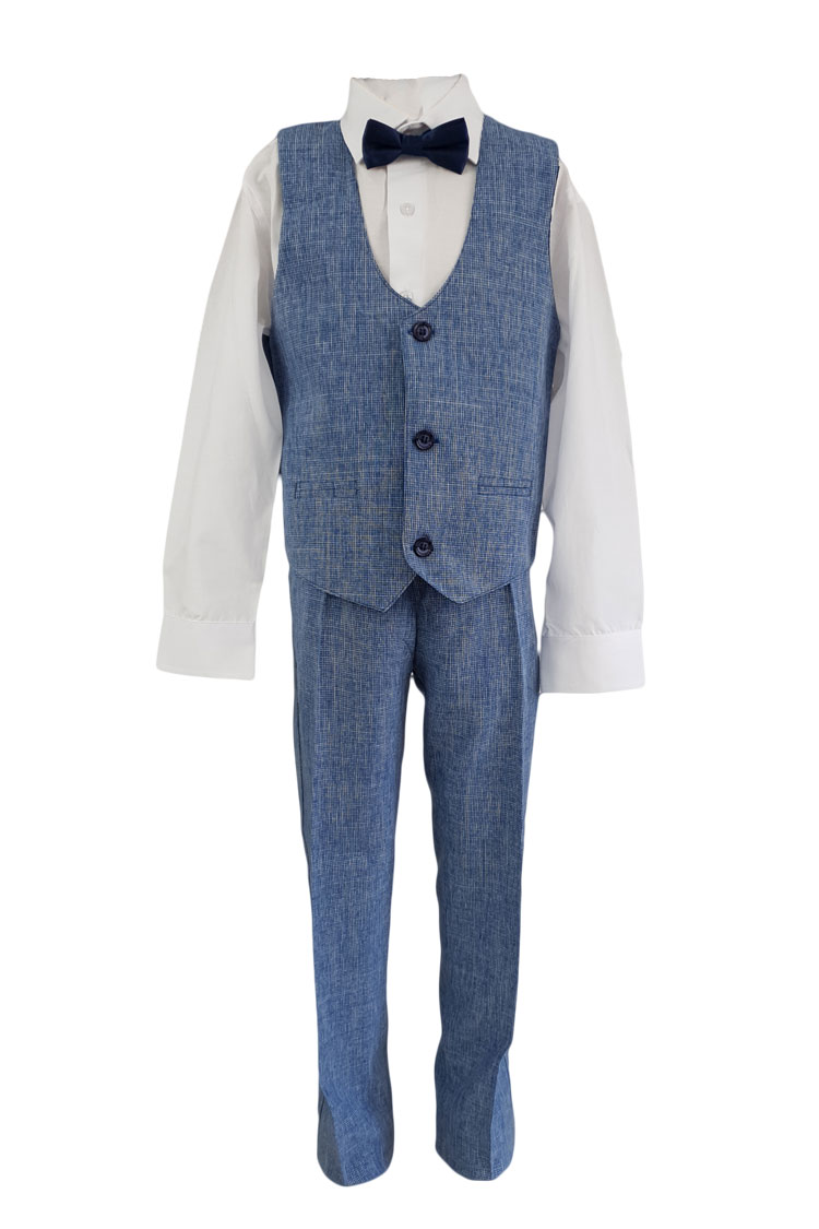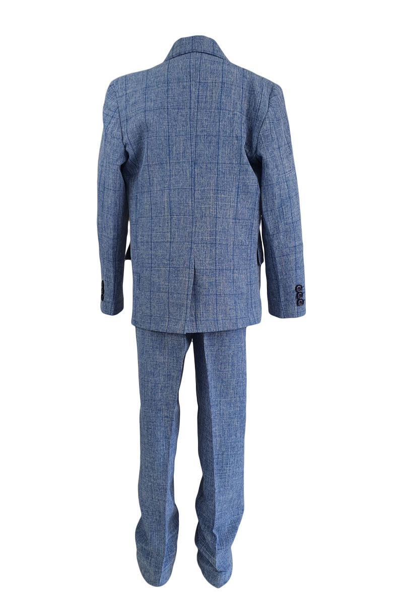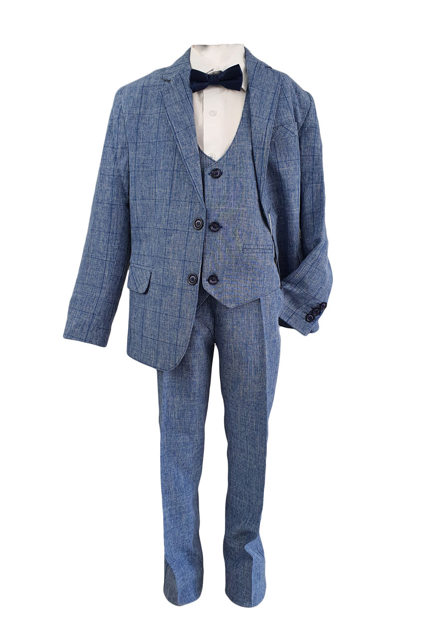 Costum elegant baieti 5 piese carouri bleu. Este alcatuit din 5 piese: sacou, vesta, camasa, pantalon si papion. Costum ocazie confectionat din materiale de calitate.