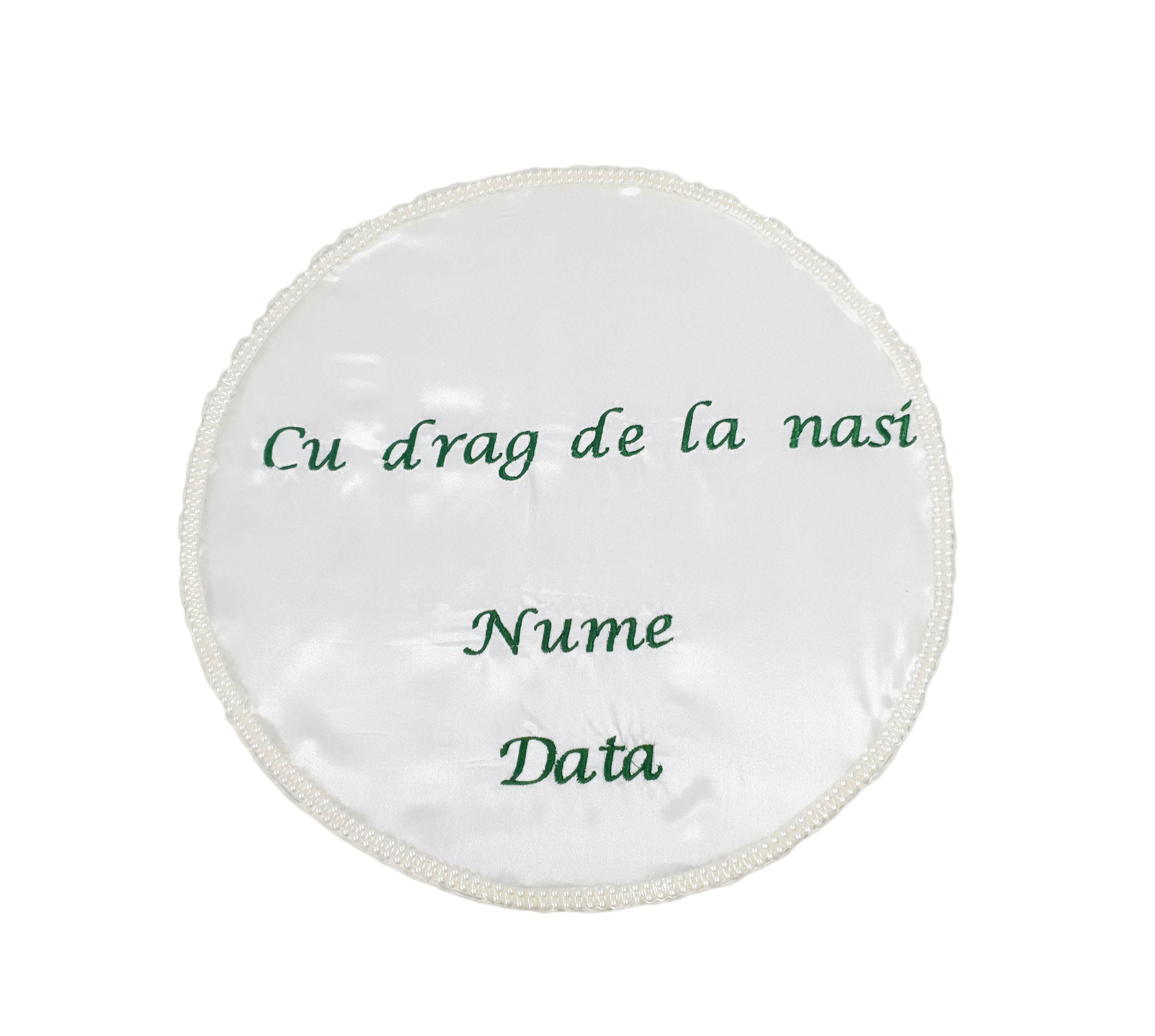 Cutie trusou personalizata, din catifea verde pentru un botez unicat. Cutia pentru trusou este eleganta si are forma rotunda. Este realizata din carton rezistent si acoperita cu satin si catifea. Capacul poate fi brodat cu numele bebelusului si data fercitului eveniment. Personalizare prin brodare. Este prevazuta cu manere. Cutia pentru trusou este practica si dupa momentul botezului, pentru a pastra amintiri din primul an de viata al bebelusului, jucarii sau alte obiecte. Alege personalizare prin brodare pe cutia trusou botez, din catifea verde , pentru un botez unicat. Broderia si cutia sunt realizate in atelierul nostru.