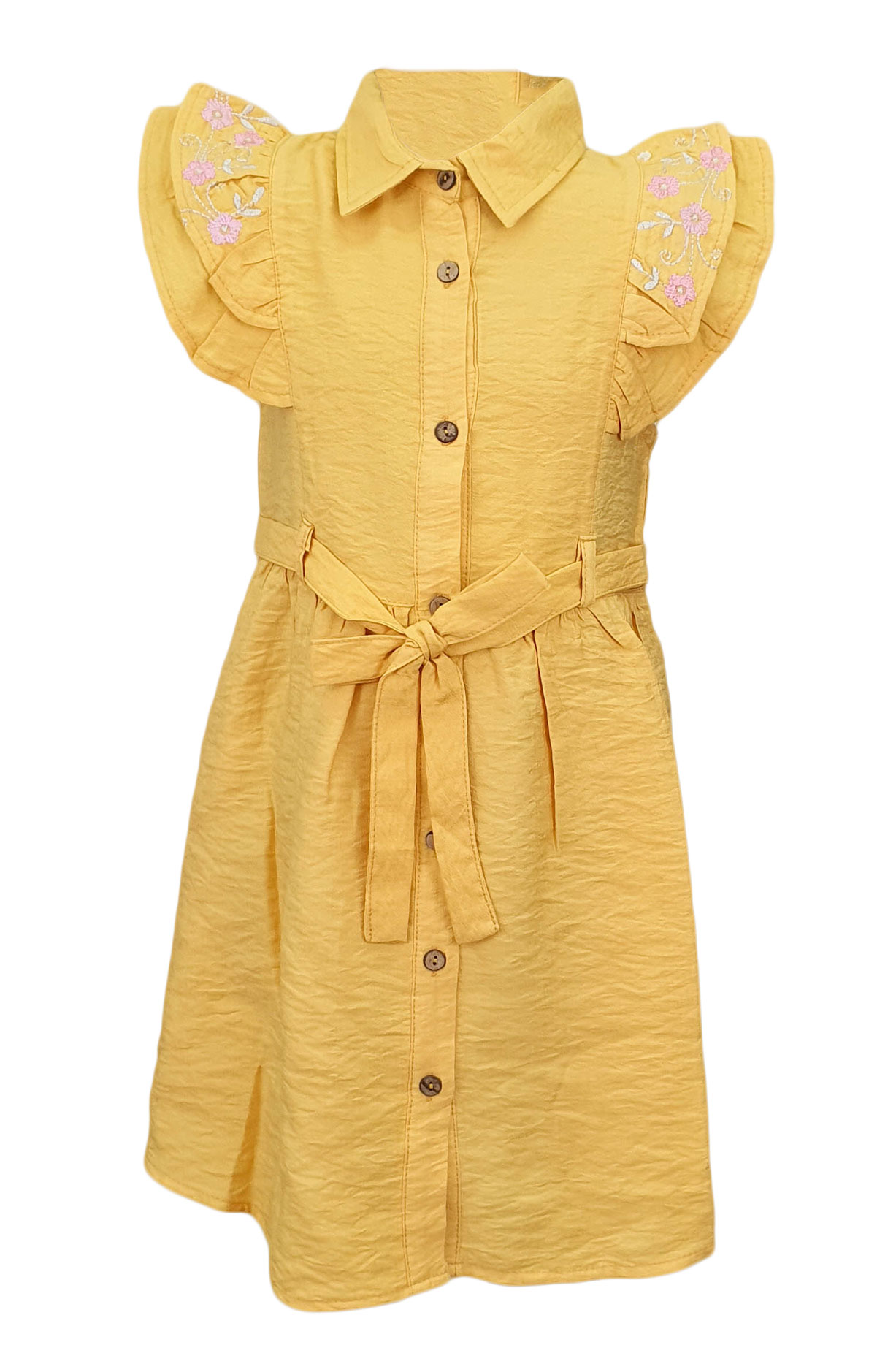 Rochie fetite pentru vara, culoare galbena, confectionata din bumbac. Este un model potrivit in sezonul cald. Pentru o imbracare facila rochita se incheie cu nasturi in partea din fata. Rochia se leaga cu cordon. Are maneca scurta. Este un model comod ce se potriveste unui stil casual-elegant. Este un model confectionat din materiale moi si placute la atingere. Rochie fetite pentru vara, culoare galbena, model trendy. Te va face remarcata cu siguranta.