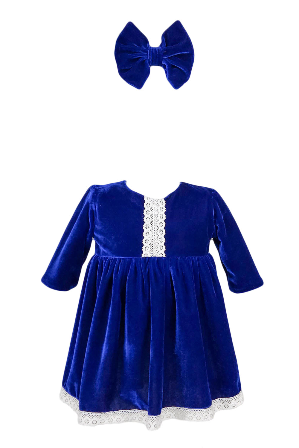 Rochie catifea albastra cu bentita asortata. Este un model casual-elegant. Rochita pentru fetite este potrivita si pentru petreceri tematice de Craciun.
