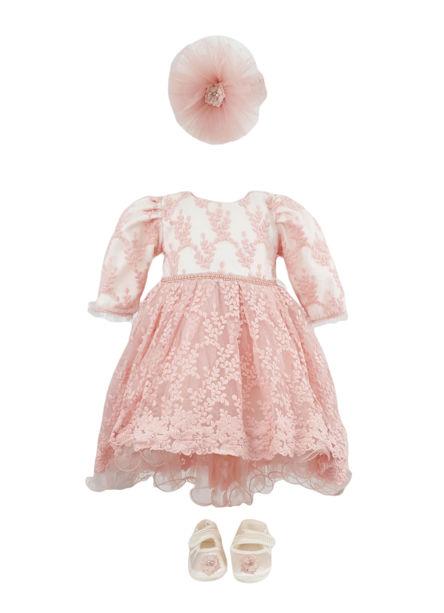 Rochie pentru botez cu trena, trei piese. Rochita cu trena este realizata din tafta si danteluta, accesorizata cu turban si papucei. Este perfecta pentru o tinuta eleganta, dar poate fi folosit cu succes in situatiile cand se cere o tinuta casual sau tematica. Pentru o imbracare facila rochia este prevazuta cu fermoar ascuns in partea din spate. Rochia este confectionata din tafta cu bumbac pe interior. O rochie de botez eleganta confectionata din materiale de calitate pentru confortul bebelusului. Rochie pentru botez cu trena, trei piese, un model trendy ce va face remarcat bebelusul la botez. Creat sa puna in evidenta copilului tau. Rochie trei piese, pentru botez un model potrivit in orice sezon. Rochia te va face remarcata cu siguranta. Produs fabricat in Romania.