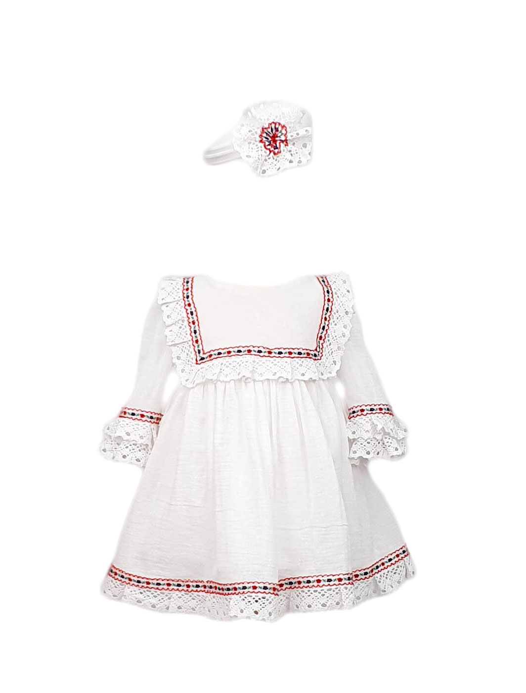 Rochita traditionala, 2 piese, culoare alba, pentru fetite. Este un model potrivit in sezonul cald si nu numai. Rochita confectionata din panza topita. La interior este captusita cu bumbac. Pentru o imbracare facila rochita se incheie cu fermoar. Rochita este decorata cu dantela. Are maneca lunga. Se incheie cu fermoar ascuns in partea din spate. Bentita elastica este asortata. Este un model comod ce se potriveste unui stil casual-elegant. Aceast model este confectionat din materiale moi si placute la atingere. Rochita traditionala, 2 piese, culoare alba, un model trendy. Te va face remarcata cu siguranta.