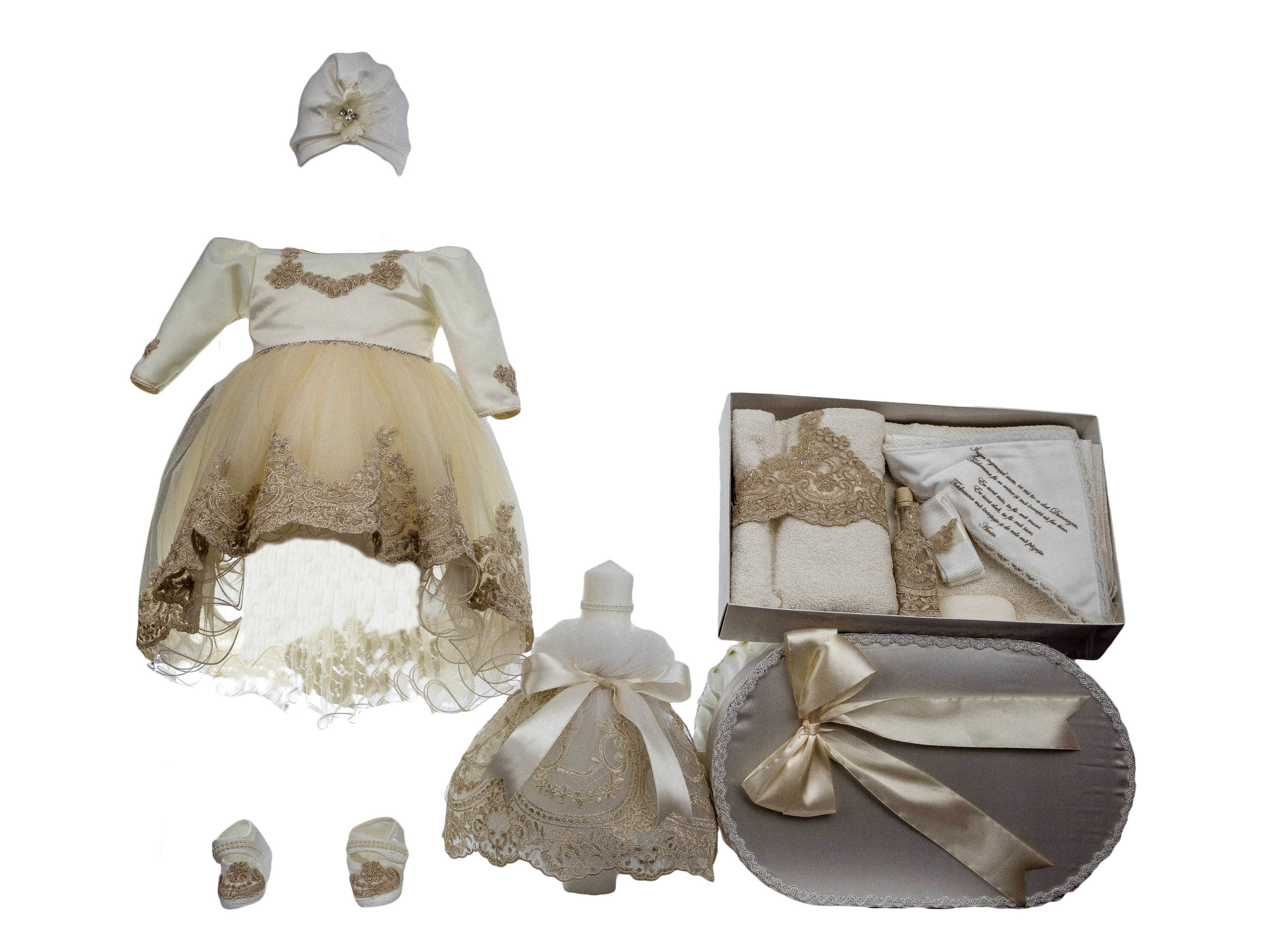 Set Botez Alice Culoare Alb-Crem, Patru Piese: rochie botez, lumanare botez, cutie transport trusou si trusou complet pentru sfanta taina a botezului.