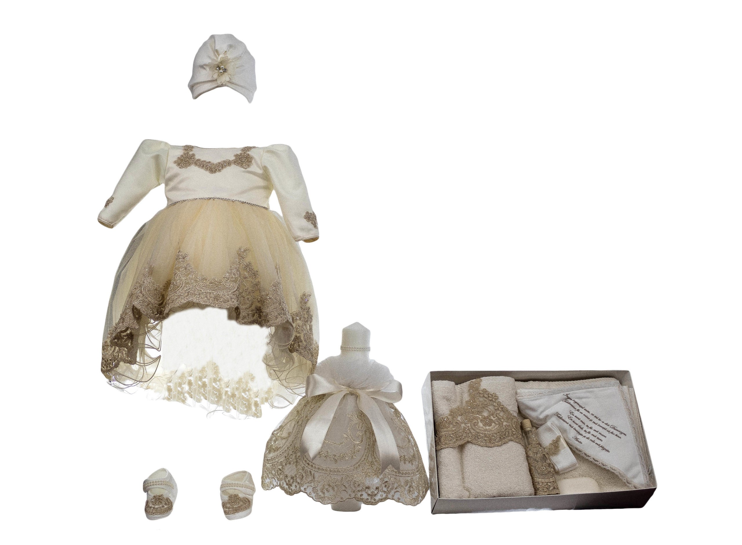 Set Botez Alice Culoare Alb-Crem, Trei Piese: rochie botez, lumanare botez si trusou complet pentru sfanta taina a botezului.