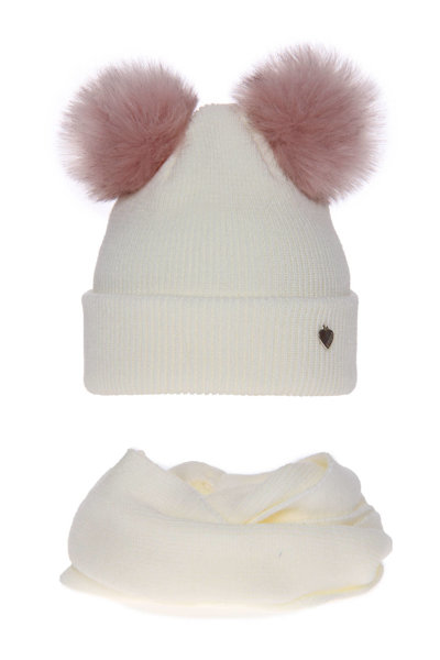 Set de iarnă pentru fete căciulă și fular circular alb cu 2 pompoane Milagros - Tissu