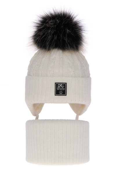 Set de iarnă pentru fete, căciulă și fular circular ivoire cu pompon, model Melodia - Tissu