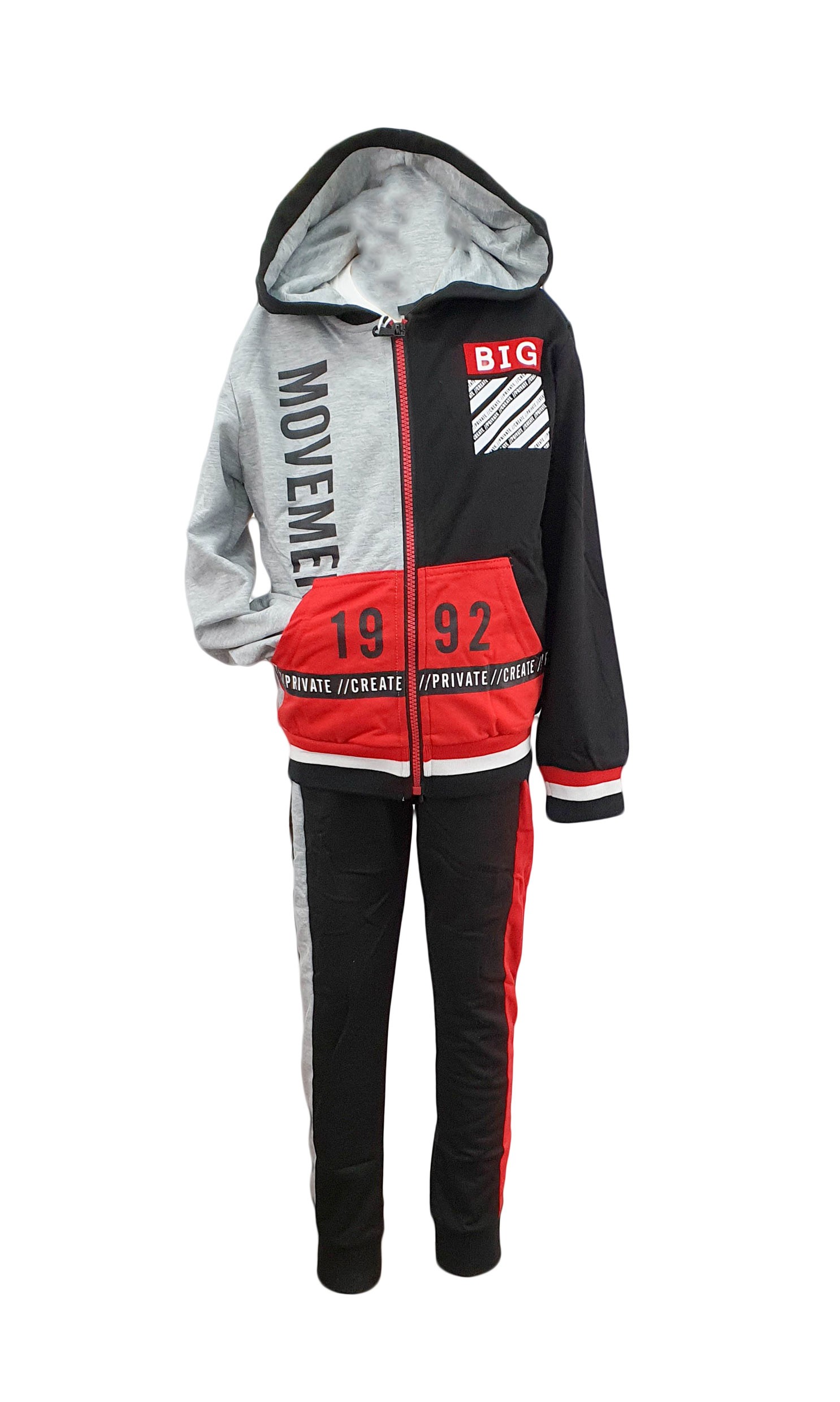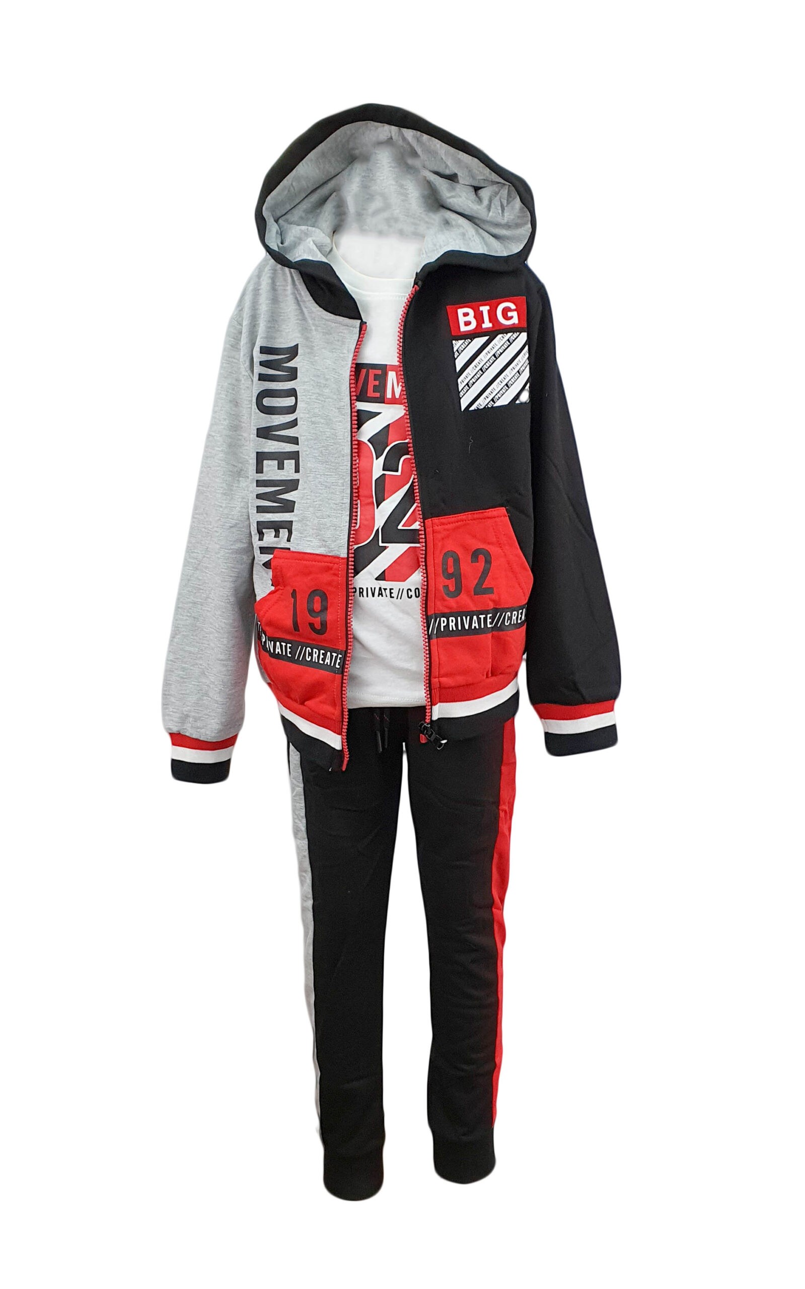 Trening copii trei piese din bumbac multicolor pentru baieti. Treningul este un element de imbracaminte din bumbac, format din: bluza, tricou cu maneca lunga si pantalon. Bluza de trening este multicolora , si este prevazuta cu gluga. Bluza se incheie cu fermoar si este cu bata elastica la maneci si talie. Tricoul din bumbac are maneca lunga si este cu imprimeu. Pantalonii multicolori, sunt prevazuti cu doua buzunare laterale, elastic, snur in talie si bata elastica. Treningul a fost initial destinat utilizarii in activitati sportive, dar a inceput sa fie putat si in alte contexte. Trening pentru copii din bumbac confortabil.
