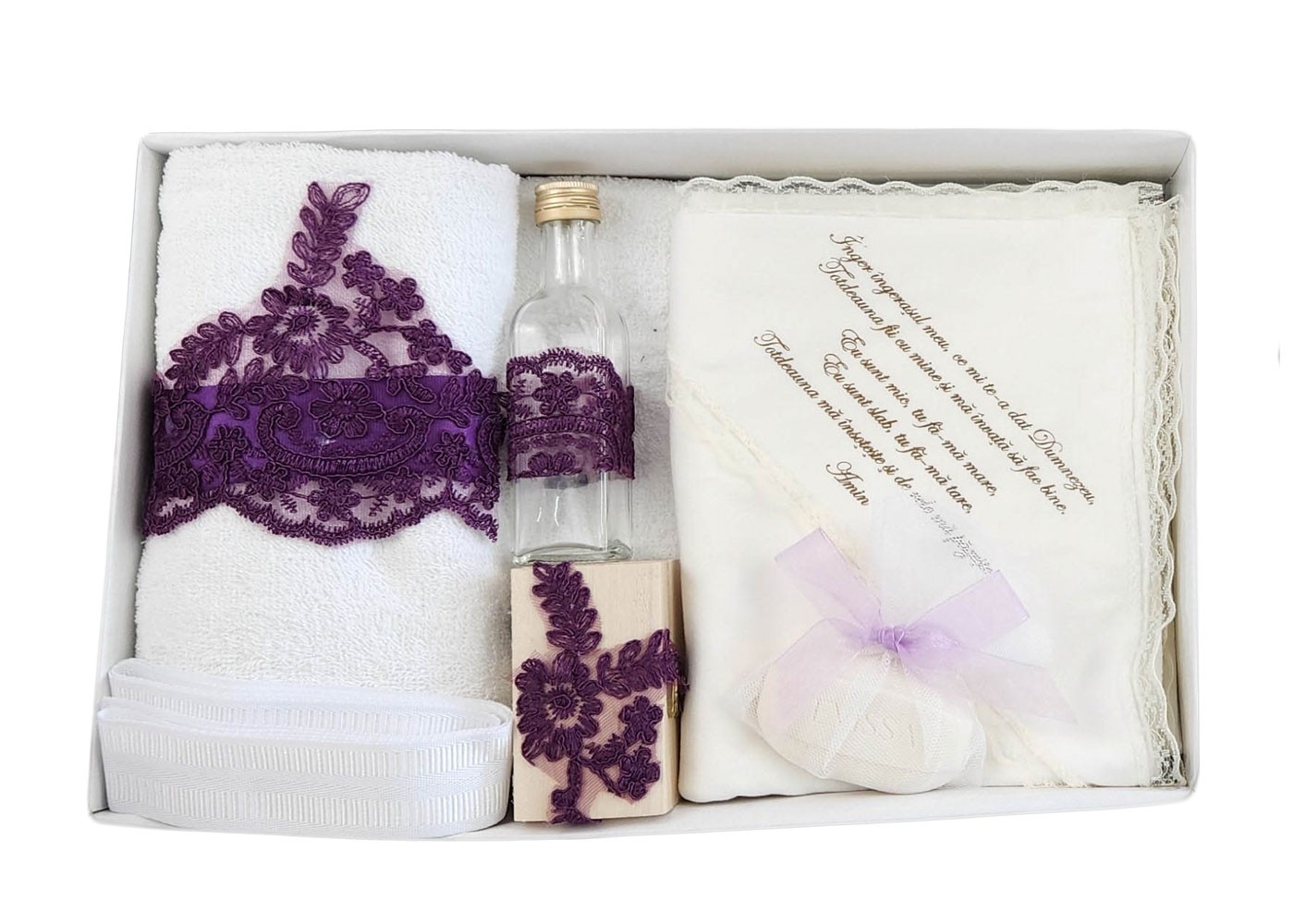 Trusou botez elegant dantela mov complet. Trusou botez compus din: prosop, sapun, prosop bebe, panza mir, cutiuta, fasa, sticluta mir. Produse din bumbac 100%.